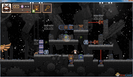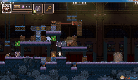 收集拼图碎片,把标记箱子推入坑中挡住激光,通关。