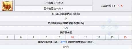 付与自身无敌状态(1回合),付与每回合获得NP的状态(3回合),获得暴击星,(500%概率)付与对〔男性〕的目标集中状态(1回合)