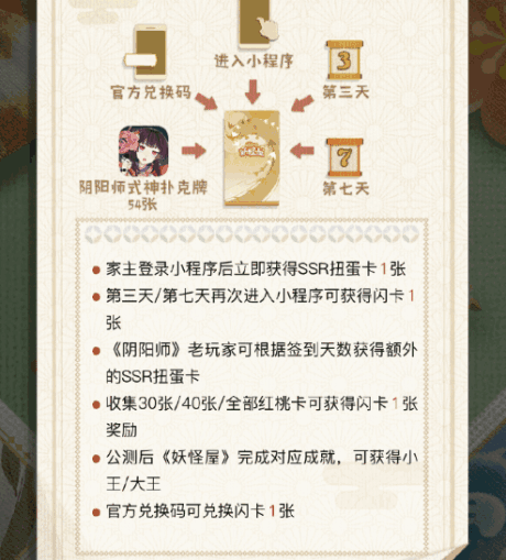 扑克牌中有8张SSR扭蛋卡,公测期间可用于兑换游戏内对应SSR式神