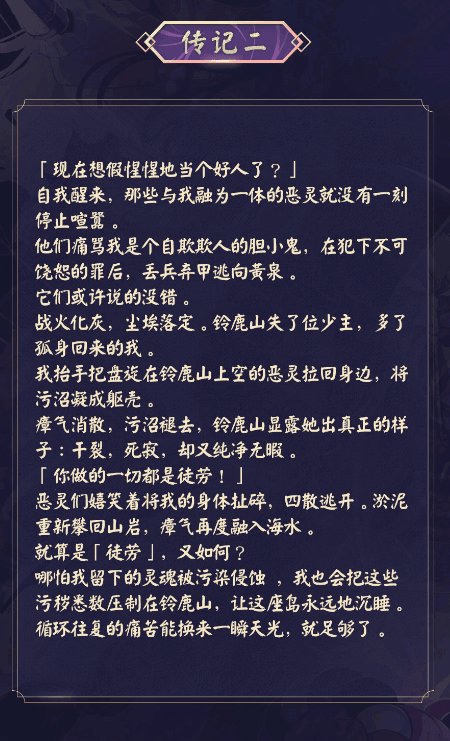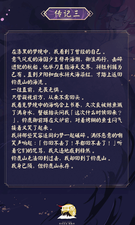 一肩担下所有黑暗,只为重铸梦中故土。重返海国的少主屹立在结界中,执刃守护昔日的家园,此处为铃鹿山,任何一寸故土之地也绝不放弃!