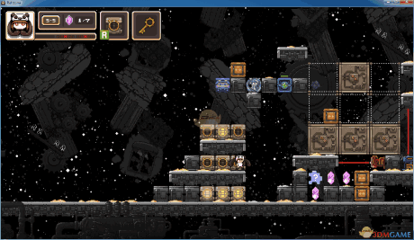 跳到上方推动左侧坚固的箱子压住机关,把机械板上坚固的箱子向右推。