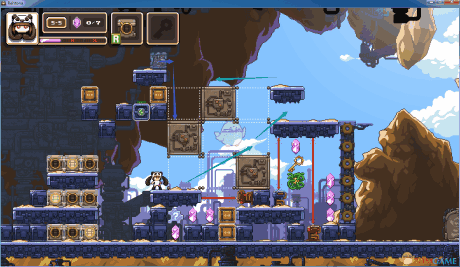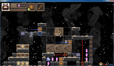 关闭右下机械板让坚固的箱子落下,向右推坚固的箱子直至其挡住激光,收集宝石。