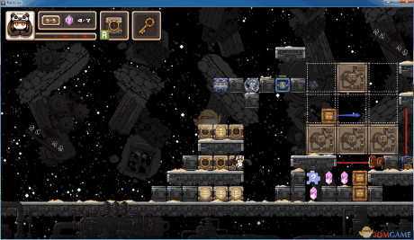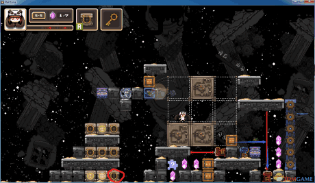 关闭左下和正下方机械板,让箱子落下挡住激光,收集宝石和拼图碎片,过关。