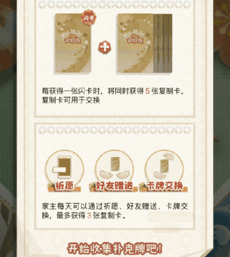 家主每天可通过祈愿、好友赠送、卡牌交换,最多获得3张复制卡