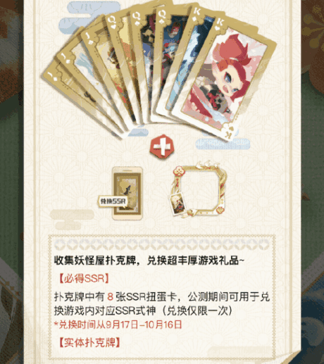 扑克牌中有8张SSR扭蛋卡,公测期间可用于兑换游戏内对应SSR式神