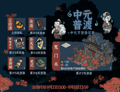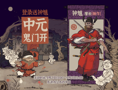 9月2日13:00起,累计登陆即可领取中元节新建筑【鬼门关】、特殊居民【钟馗】~具体活动内容如下: