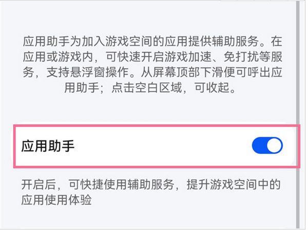3、关闭【应用助手】右侧的开关,开启后从屏幕顶部下滑便可呼出游戏助手。