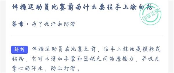 看过体操比赛的人们都知道,体操运动员在参加吊环、鞍马、单杠、双杠和高低杠等项目的比赛时,上场前都会在手掌上抹一些白色的粉末。今天蚂蚁庄园就是问大家,体操运动员比赛前为什么要往手上涂白粉?