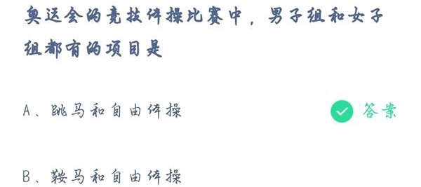 体操是现代奥运会的一个项目,当然它是一个统称,分别包括“竞技体操、艺术体操和蹦床”等项目。今天蚂蚁庄园小课堂问大家的是,奥运会的竞技体操比赛中,男子组和女子组都有的项目是什么?
