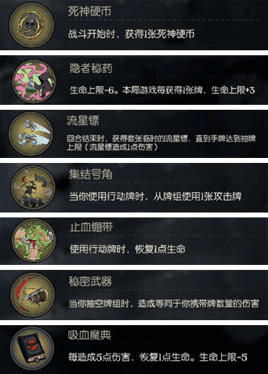 【死神硬币】没想到第一个会放死神硬币吧?个人强烈推荐。最安逸的起手。能把初始装备【隐匿服】的闪避率提高到100%,并且每闪避一次抽一张牌。第一回合打出硬币无敌一回合,第二回合手牌爆满起飞。缺点是,你的初始装备需要一直佩戴,或者保留【死神硬币】,抽到【隐匿服】再使用。