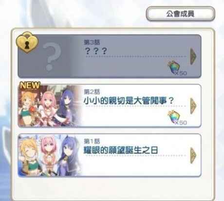 公会剧情需要公会成员总羁绊值达到一定数值(公会成员的总羁绊值为各角色羁绊值相加的总和),查看该公会成员可从通过点击剧情界面右上角的按钮,观看每个公会剧情会奖励50宝石。