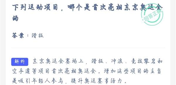 目前东京奥运会正在如火如荼的进行着,为了吸引更多年轻人参加奥运比赛,这届奥运会增加了几个运动项目,将为世界带来新的奥运明星。今天蚂蚁庄园就是问大家,下列运动项目哪个是首次亮相东京奥运会的?