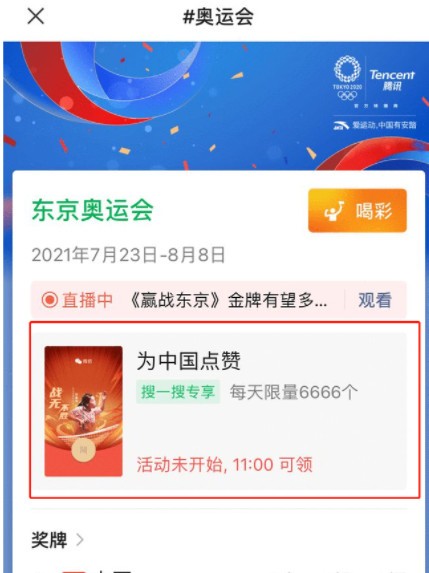 2、在此输入奥运会进入搜索,页面如下图所示,点击红框位置即可领取。