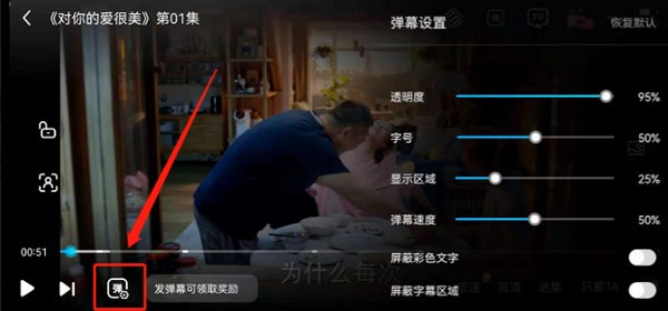 另外,如果大家想看弹幕又嫌内容太多的话,可以点击下图框中位置进行调整弹幕的显示区域、字号、速度等。