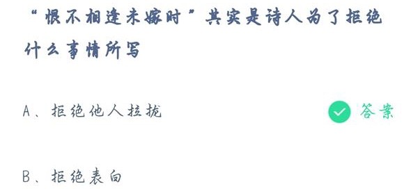 在唐诗当中有,很多诗歌都是写的对于人生的感悟,“还君明珠双泪垂,恨不相逢未嫁时”这句诗是有名的写出人生遗憾的诗句。今天蚂蚁庄园就是问大家,“恨不相逢未嫁时”其实是诗人为了拒绝什么事情所写?