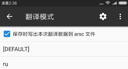 在 Arsc 翻译模式的主界面,点击右上角的设置按钮,就可以看到“保存时写出本次翻译数据到 arsc 文件”的选项。