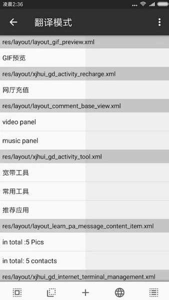 一些应用的部分文字可能不在 arsc 文件,而是在 apk 里面的某些 xml 文件中,而一个 apk 有非常多个 xml 文件,要一个个去查找和翻译显然不方便,而 MT 就可以自动帮你遍历所有 xml 文件,找出所有可以进行翻译的文本。