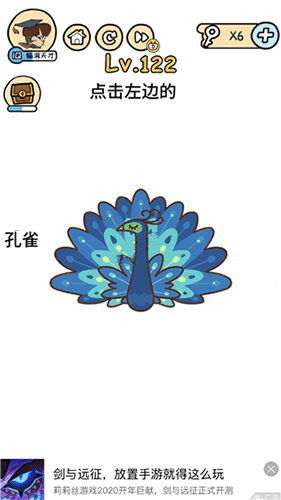 脑洞大大大是一款多个关卡的有趣的休闲益智手游,那么其中第122关点击左边的孔雀答案是什么,下面一起来看看吧。