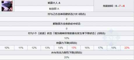 付与己方全体回避状态(1次·3回合),解除敌方全体的必中状态,付与1个〔迷惑〕状态「视为精神异常的暴击发生率下降状态」(3回合),防御力下降(3回合),Arts攻击力耐性下降(3回合)