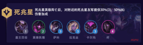 羁绊:暗星英雄死亡后,会给最近的一个暗星种族友军增加30/50%伤害加成(对应3/6羁绊)