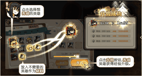 其中【养成】可以进入当前英雄的成长界面,通过吞噬其他卡牌进行升级。