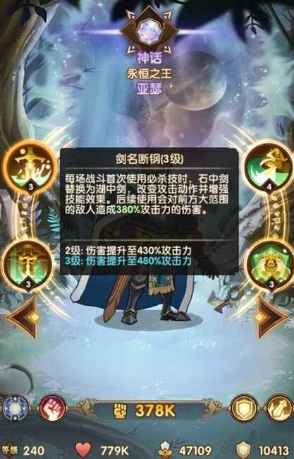 每场战斗首次使用必杀技时,石中剑替换为湖中间,改变攻击动作并增强技能效果,后续使用会对前方大范围的敌人造成380%攻击力的伤害
