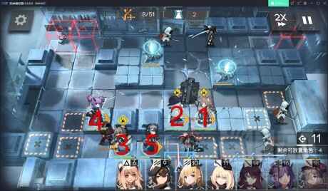 1.按图中数字顺序部署干员,第1个凿冰者普攻带走