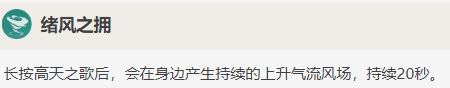 温迪爆发输出来源,有两种释放模式,点按是智能施法到目标位置,范围小伤害低,CD只有6秒,适合速切流打法。长按是以自身为中心大范围释放,可以升天规避伤害,伤害也比点按高,CD有15秒那么长,适合站场输出的时候用。PS:可以击飞没有霸体的怪