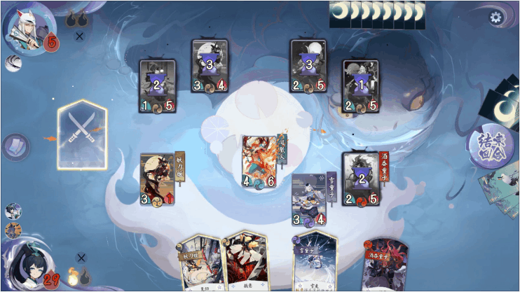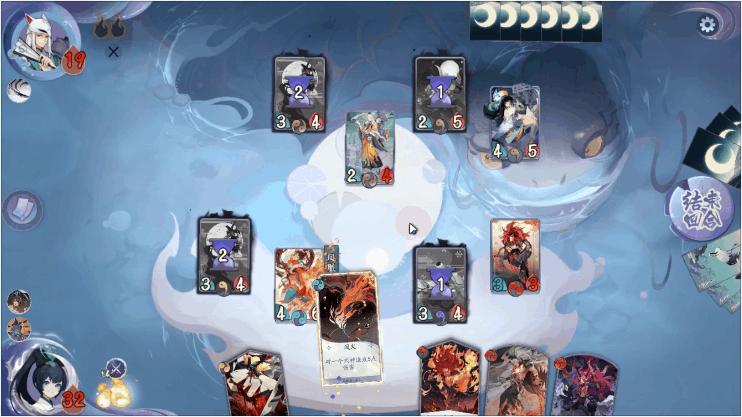 开局尽量寻找低级战斗牌,因为我们要在前期打出足够多的伤害,毕竟敌方生命值有40点。如果有“凤火”的话建议留一张,方便解敌方青行灯。