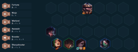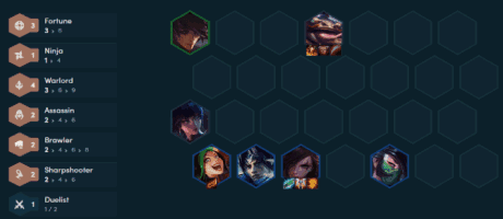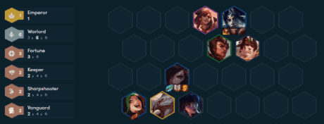 通常慢速4-3或者4-5到八人口,绝对是全场第一个八人口的,这个时候要梭哈一下,把整体质量抬起来,8人口那么漫长,不先稳稳血继续连胜是不行的,这个时候,前期连胜用的天选就可以卖了,凑6三国,重点找天选的卡特和赵信,三国这8张卡,一个都不能换,于是你缺的,就剩下决斗和刺客的羁绊了,或者来个三国加上三国转凑9三国,剩下的除了三星就没什么质变的提升了,这也是很多人玩三国烂分的原因,前期连胜没做好,后期没有足够的空间质变,就会很难受,毕竟放眼一望一个四费主C都没有。