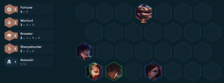 3-2上六人口,如果前期纯连胜的话,你会特别有钱,如果你两星运气很差,可以小D一下凑一些两星组合出来帮助继续连胜,套路的特点是吃装备的体系特别的多,上图觉得合适的装备都可以开始丢了,没有主C卡阿卡丽和蛤蟆通吃。