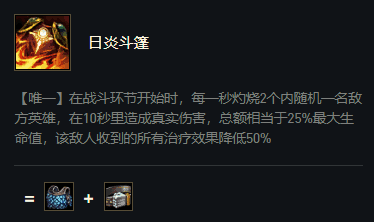 【唯一】在战斗环节开始时,每一秒灼烧2个内随机一名敌方英雄,在10秒里造成真实伤害,总额相当于25%最大生命值,该敌人收到的所有治疗效果降低50%