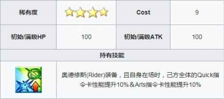 奥德修斯(Rider)装备,且自身在场时,己方全体的Quick指令卡性能提升10%&Arts指令卡性能提升10%