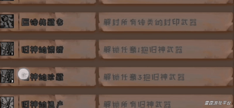 装备类的成就为解锁装备,例如“工匠之心”需要玩家在商店打造一次封印武器,“旧神的遗产”需要解锁所有旧神武器,“巨锤典藏者”需要解锁所有锤类的封印武器。