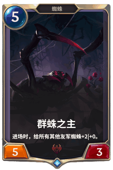 lor中,群蛛之主是诺克萨斯的单位卡,属于史诗紫卡,那么游戏中群蛛之主怎么样,效果如何,属性如何,下面一起来看看吧。