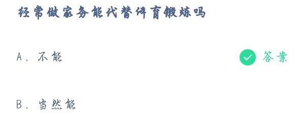 家务劳动是每个人每天必须面对的活动,拖地、洗碗、洗衣服等家务劳动做起来都比较累,所以很多人会觉得每天做家务已经很累,不需要专门进行体育锻炼了。今天蚂蚁庄园小课堂就是问大家,经常做家务能代替体育锻炼吗?一起来看看吧。