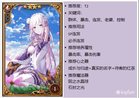 初期四星爱蜜莉雅暴击率不足时最好的伙伴。在后期可能就显得不那么实用了,因为SP技能倍率太低,打手们不如自己堆暴率,然后换一个更好的伤害辅助。
