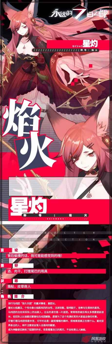 永远的7日之都星灼是旅行马戏团悠久乐园的魔术舞者,她擅长火焰魔法喔,那么永远的7日之都星灼技能属性怎么样、小狐狸星灼好用吗,大西洋软件园为大家介绍。