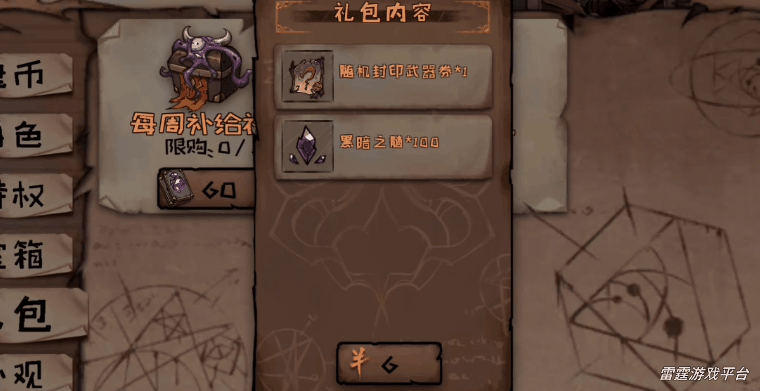 在商城中同样还有礼包供玩家选择,例如可以通过充值获取新手礼包,新手礼包中包含随机封印武器券和100个黑暗之髓,也可以使用魄币购买每周补给礼包,里面包含2张武器试用券和6瓶超强镇静剂等,这些礼包内的物品价值还是相当高的。如果实力不够,不妨通过购买礼包来增强自身的战斗力。