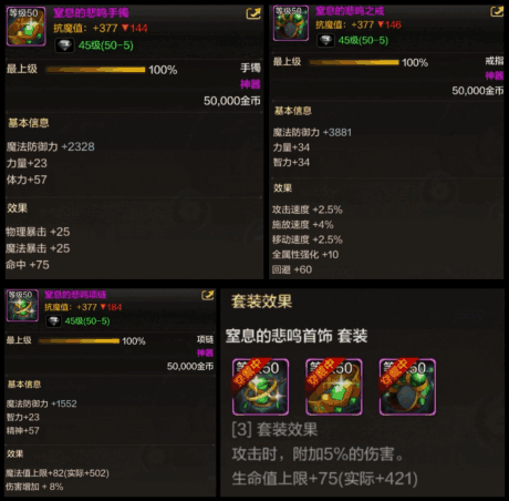 首饰部分和我们前面说的武器同理,在史诗套毕业前,远古图的首饰也依旧是我们的最优选择——窒息的悲鸣首饰套装。