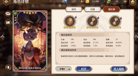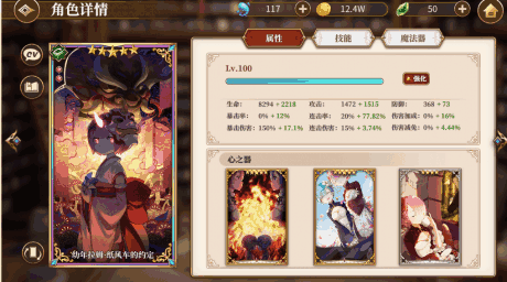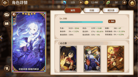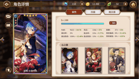 旗袍蕾姆的装配搭配如下图,心之器我把自己有的回复怒气的心之器都装备上了,一般情况下,回怒气的心之器都具有高血量,回复的怒气保证每两回合释放一次必杀技能,并不是难事,同时血量高也能提升AP技能回复的生命量,一举两得。魔法器为了保障队伍输出(睡衣艾和小拉姆都无脑AP输出)上了每局回一点Ap的,其实对于短线战斗,战斗开始回4AP的应该更好。因为我就是喜欢蕾姆,加之抽卡歪到两只,后来索性把蕾姆的大招升满了。目前,以现有装备,每两回合释放一次普通必杀技能怒气回复还是比较充足的,但是每三局释放一次满怒必杀,偶尔会差一两点怒气,后期随着心之器突破,这个问题并不难解决。