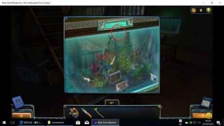 112、水族箱底座按钮——放水波吊坠——玩游戏,让珍珠掉进出口的洞里——上面的水族箱打开——钥匙浮起——用长钉挑起钥匙。