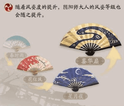 随着'风姿度'的提升,阴阳师大人的风姿等级也会随之提升。风姿等级由低到高分别为:春时雨、花信风、星月夜、銮华扇。