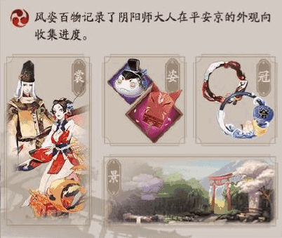 风姿百物系统入口位于'庭院'-'图鉴'中,记录了阴阳师大人在平安京的外观收集情况,包括:阴阳师皮肤、御灵皮肤、式神皮肤、庭院皮肤、结界皮肤、头像框、式神姿度、式神配饰、阴阳师动作效果、小动物配饰等。
