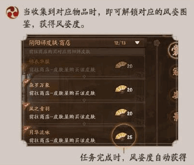 当收集到风姿任务对应的外观时,即可完成对应的风姿任务,获得'风姿度'。同时,还有一些组合任务,集齐要求的全部外观后,可获得额外'风姿度',部分组合任务还有专属插画奖励。