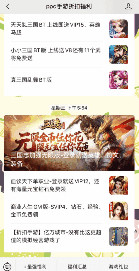 2.关注微信公众号后,玩家们可以点击最强福利即可下载海量好玩的折扣手游,用优惠的价格充值获取游戏超强福利,点击福利汇总、游戏礼包还有丰富VIP福利赠送哦~