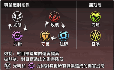 到绿+2为止(伙伴等级上限60)的突破材料各职业都是一样的,后续突破材料不同需要刷不同的图获取,先后顺序为:攻袭、守护、法师(9、11、13……)、召唤、治愈、光明、咒术(10、12、14……)。克制表如下