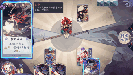 1、对局中桃花妖的卡牌“桃之夭夭”,可以触发“鼓舞”效果,为式神的下一次出击提供格外的效果加成(两点力量+两点护甲)。