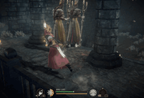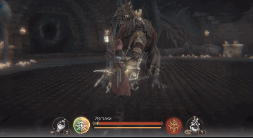 贝妮塔的武器「净血圣座」可以像鞭子一样,甩出脊索抽打敌人。使用「净血圣座」会消耗贝妮塔自己的生命,转化为她背后贮血瓶中的净血。使用「净血圣座」攻击敌人,也会获得净血,存入贮血瓶。消耗净血,可释放战技。