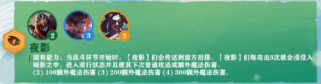固有能力:当战斗环节开始时,们会传送到敌方后排。们每攻击3次就会浸没入暗影之中,进入潜行状态并且使其下次普通攻造成额外魔法伤害。